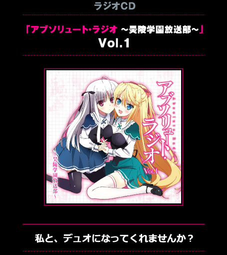 TVアニメ『アブソリュート・デュオ』の事を山本希望、山崎はるか、今村彩夏、諏訪彩花のキャストのメンバーが4人でお送りする『絶対的に』楽しいこと間違いなしのラジオがCD化。